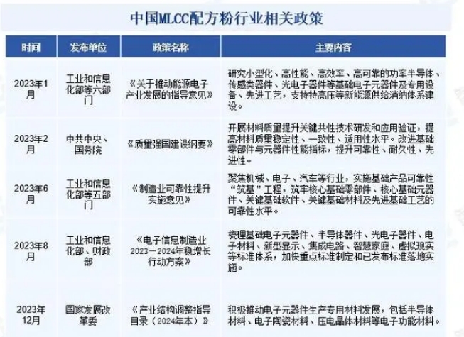 隨著電子元器件在各個領域的廣泛應用,國內對于電子元器件行業的發展給予了政策上的支持,鼓勵技術創新、加快產業升級等。同時,政府也在加強行業監管,提高產品質量和可靠性,為MLCC配方粉行業的發展提供了良好的政策環境。如2023年8月,工業和信息化部、財政部發布《電子信息制造業2023—2024年穩增長行動方案》,其中提出梳理基礎電子元器件、半導體器件、光電子器件、電子材料、新型顯示、集成電路、智慧家庭、虛擬現實等標準體系,加快重點標準制定和已發布標準落地實施。2023年12月,國內發展改革委發布的《產業結構調整指導目錄(2024年本)》中,提出積極推動電子元器件生產專用材料發展,包括半導體材料、電子陶瓷材料、壓電晶體材料等電子功能材料。