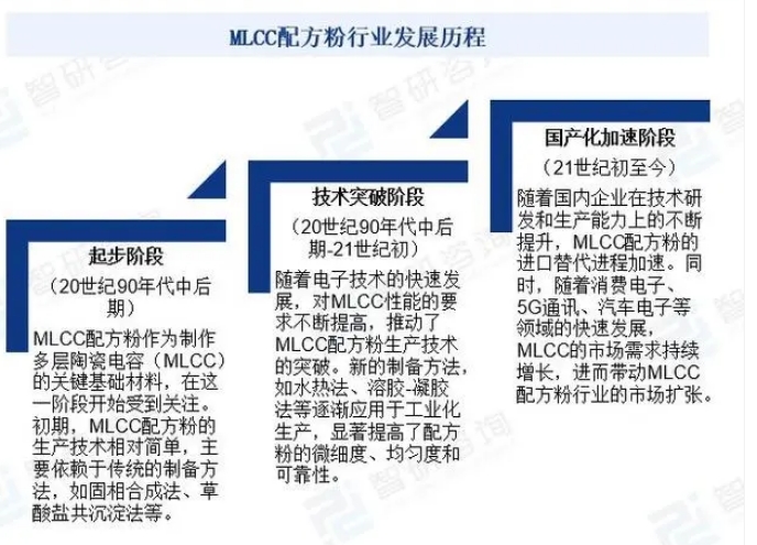 MLCC配方粉行業早起源于20世紀90年代,當時,MLCC配方粉作為制作多層陶瓷電容器(MLCC)的關鍵基礎材料,開始受到關注。初期,行業生產技術也相對簡單,主要依賴于傳統的制備方法,如固相合成法、草酸鹽共沉淀法等。20世紀90年代中后期-21世紀初,隨著電子技術的快速發展,對MLCC性能的要求不斷提高,推動了MLCC配方粉生產技術的突破。如水熱法、溶膠-凝膠法等逐漸應用于工業化生產,顯著提高了配方粉的微細度、均勻度和可靠性。21世紀初至今,行業技術水平不斷提升,進口替代進程加速。隨著消費電子、5G通訊、汽車電子等領域的快速發展,MLCC的市場需求持續增長,進而帶動MLCC配方粉行業的市場擴張。